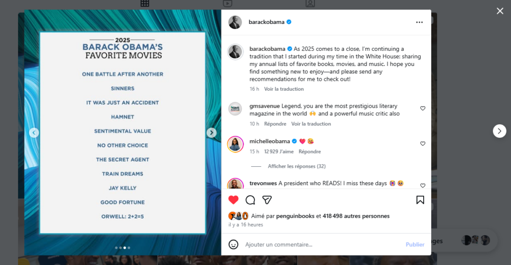 For several years now, Barack Obama has made it a tradition to share his cultural highlights at the end of each year. After books, his favorite films of 2025 were unveiled on Instagram, confirming his role as a cultural tastemaker. His selections are eagerly awaited by moviegoers and industry insiders alike, reflecting both curiosity and a keen eye for stories that resonate with the times.